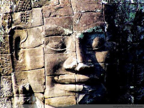 整座建筑在第三层达到高潮:54座四面佛塔连绵耸立(四个面分别代表慈、悲、喜、舍),216张微笑的脸构成了一张巨大的无形的网,迷离而具体,亲近而疏远,永远走不进却又无法逃离。行走其中,任何一次抬头或转身,那佛就在你眼前,你永远都逃不出那暧昧的眼神。石头堆砌的脸斑驳而沧桑,前额宽大,眼睑下垂,大鼻子厚嘴唇,嘴角略微上翘,安详而悲戚,貌似宽容又似乎内含嘲讽。你问佛为什么笑佛自拈花不语,人家玩的就是玄虚,要的就是让你丈二和尚摸不着头脑,如此才能体现他的伟大。所以,放聪明点儿,要相信人人皆佛咱们自己更伟大。