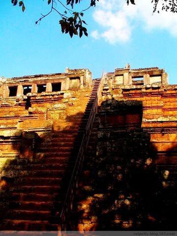 通过大象台可到王宫正门。按照高棉传统,只有神才能居住用砖石盖的房子,凡人包括国王都只能住木屋。因此,除了宫墙、石门和宫内的一座寺院遗址外,木质的王宫早已荡然无存。这残存的寺庙便是俗称的“空中宫殿”(Royal enclosure)。名为宫殿,实则是皇家祭祀的神庙。如今,它的台阶几乎坍塌殆尽,层次不明,耸入空中的飞檐上立着的神兽也是腿脚尽数毁去,修复者用来固定的钢筋裸露在空中,纤瘦而无力。绕到背面,在过去的台阶旁架了一个木梯子,斜度颇大,我们小心地爬了上去,上面是一堆碎石,四周的回廊处,门梁几乎全部歪斜倒塌。
