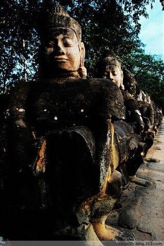 渐渐靠近吴哥城(Ankor Thom),城门上四面佛的微笑神秘而含蓄,两侧是威武的德瓦拉巴拉列队守卫,各自抱着一条那伽灵蛇(Naga),七头蛇首高高昂起,保护着这座千年的古城。