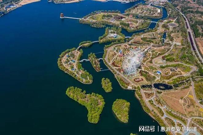 泰山天颐湖旅游度假区,被自然的巧手调绘成一幅五彩斑斓的春天画卷,蓝天下的天颐湖碧波如玉,绿色的岛屿和环湖的鲜花组合成世界上最缤纷的调色盘。