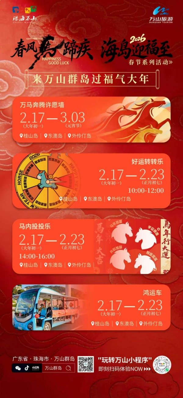 除了传统年俗活动,各海岛还将举办迎春送福系列重磅活动,带游客玩转海岛新春。桂山岛、外伶仃岛、东澳岛三岛将同步开启“春风马蹄疾·海岛迎福至”主题活动。万马奔腾许愿墙、好运转转乐、马内投投乐、鸿运观光车……四大打卡点寓意“马上好运”,拍照玩乐祈福一站式搞定。