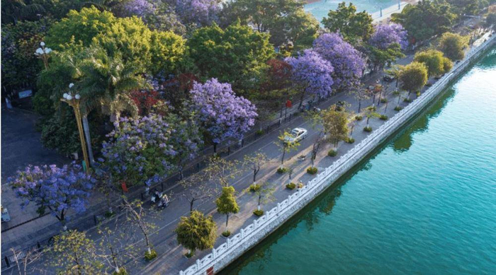蒙自尼苏小镇的蓝紫色梦幻长廊不容错过,蓝花楹沿着大屯海边盛放,航拍视角下美得令人震撼。南湖公园道路两旁的蓝花楹,是更唯美的视觉暴击,阳光穿透半透明花瓣,碧蓝的湖水映衬着蓝紫色花朵,诗意而清新。