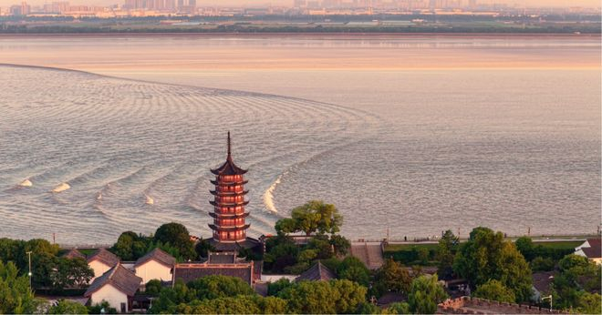 踏入海宁的第一站,先奔赴盐官观潮胜地公园。站在观潮台上静静等候,看远处江面慢慢浮出一条细细的白线,等潮水奔涌到跟前,清冽的江水水汽扑面而来,带着独有的清凉气息,积攒许久的浮躁,一瞬间就被抚平了。
