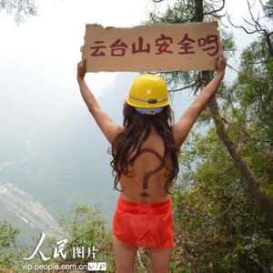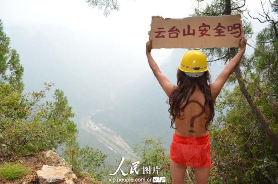 28日下午,一名头戴安全帽、上身赤裸、下身仅围有一条红色丝巾的年轻女子,站在河南省修武县云台山风景区小寨沟山峰顶上,举着一块写有“云台山安全吗”字样的纸牌,其背部还画着一个大问号。据了解,女子叫姓杨,河南洛阳人,是一名登山爱好者。