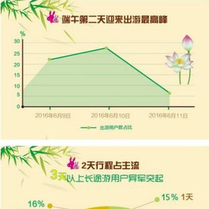 驴妈妈大数据显示:80%用户选择周边游,2天行程的短途游是主流,孩子们喜欢的主题乐园、动物园类景区持续爆棚,一些古镇也出现了人山人海的景象。广东、江苏、浙江周边游人气最旺,端午期间拼假长途游成为另一大亮点,国内的三亚、北京、舟山、杭州人气高,境外的日本、韩国、泰国、香港等是热门目的地,邮轮旅行成新宠。