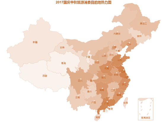 2017年国庆中秋假日旅游消费热门目的地辐射范围较广,华东、华中、华南、东北地区旅游消费热度均较高,其中热度TOP10城市均为知名旅游城市。