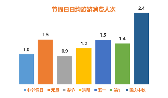 在今年六个节假日中,国庆中秋假日日均旅游消费人数最高,为春节的2.5倍,五一的1.6倍。国庆中秋假日时间较长,气温舒适,居民出游意愿较高,带来更多的旅游消费。
