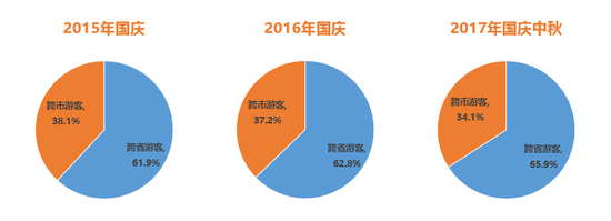 今年国庆、中秋连休形成八天超级假期,激发了居民的中长线出游热情,游客中跨省游客人数较前两年呈上升趋势,占比达近三分之二。