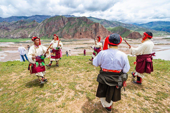 当地的藏人,奏起了琴、跳起了舞,表达他们对扎曲的敬畏,也表达对远方客人的欢迎。悠扬的乐声,盘旋着升上高原的天空,被凛冽的风吹散,带到了无尽的远方。