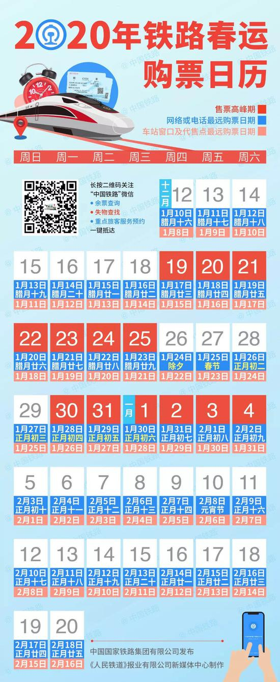 2020年放假安排显示,春节放假7天,为1月24日至30日。其中,1月23日、24日为回家高峰日,1月29日、30日为返程高峰日。目前,火车票预售期为30天。据此推算,2020年1月10日(春运首日)的火车票,2019年12月12日就开抢;2020年1月24日(除夕)的火车票,2019年12月26日开抢;2020年1月25日(大年初一)火车票,2019年12月27日开抢。至于返程票,2020年1月29日(大年初五)火车票,2019年12月31日开抢;2020年1月30日(大年初六)火车票,2020年1月1日开抢。
