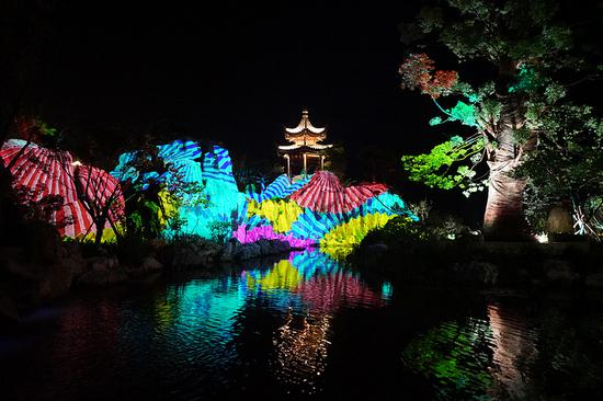 洗尘门、玉清台、缘生池、太虚幻境……19个观赏点让建筑和灯光交相辉映。夜色变得明艳而生动。