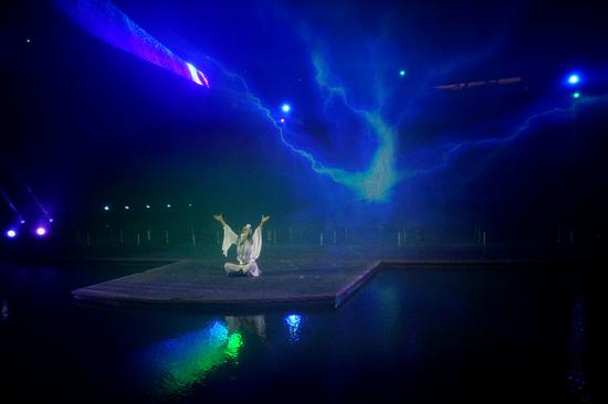 以水幕电影为载体,配合真人演出。声光、水火,一起创造了一个气势磅礴的修真世界,还原仙人葛玄求道飞升,广济众生的传奇故事。现代的科技,可真比仙术幻化还要让人感觉神奇。