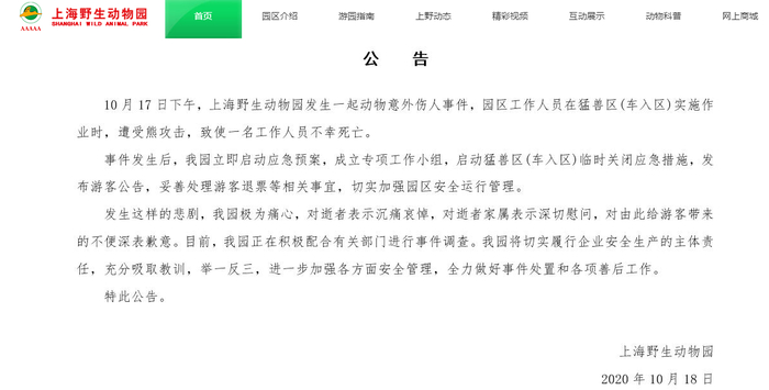 新京报快讯 据上海野生动物园网站消息,10月18日,上海野生动物园发布公告,10月17日,园区一名工作人员在猛兽区实施作业时,遭受熊攻击身亡。