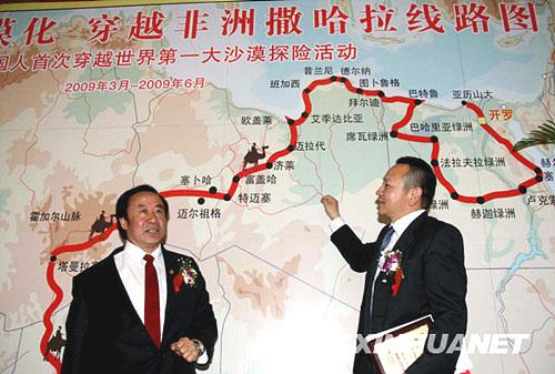 3月1日,地质学家费宣(左)和探险家金飞豹在启动仪式上介绍穿越非洲撒哈拉线路
