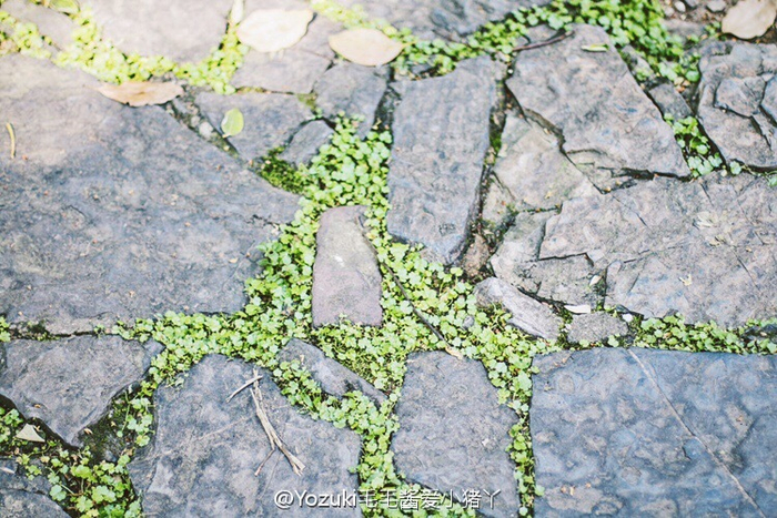 不规则小石板铺成的路,缝隙之间长满了青葱的小草,脚下和抬头都是满眼绿意。