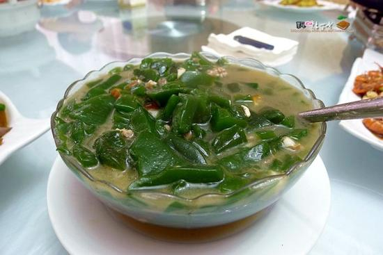 谁认识这个呀,江浙还有皖南一带的朋友可能认识,这也是豆腐,当地人叫观音豆腐,是用一种绿色植物叫观音柴的制作成,只有夏天才有的吃的噢。 应该也是有清热作用,其实原理都有些像凉粉呀等等。徽州还有种紫黑色豆腐,叫菜籽豆腐的,以后有机会再拍给你们看。