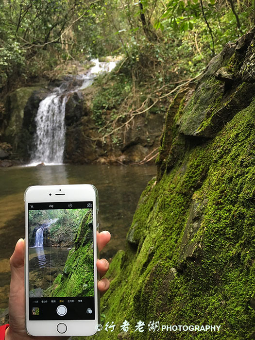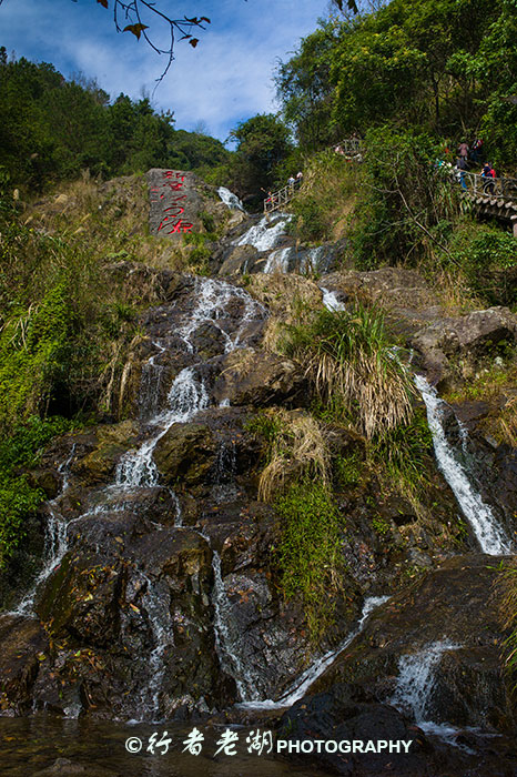 走到瀑布跟前,上面有红色的雕刻“新丰江之源”几个大字,据说这些山泉水全部汇入到新丰江。三叠泉寒气逼人,如果是夏季一定是很凉爽,登山一直是沿着山间的小溪和水源往上去。