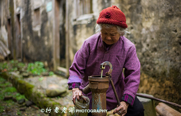 这个客家围屋基本上处于半放弃状态,没有人居住,但也有人在屋顶是维修。在围屋里面见到一位老人,跟我们聊着天,还带我们去参观了很早的打水用的井,还给我们演示如何打水的。从她这里了解一些 “ 九栋十八井 ”的情况。