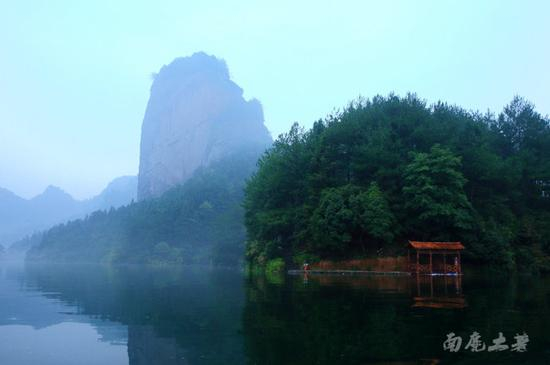 入秋连续的江南小雨淅淅沥沥,九仙湖的游客并不多,湖面静谧得如一面镜子。升腾的水雾在群峰间迷漫,也将天空压暗,视线柔和迷离,似一幅天然的山水画卷。