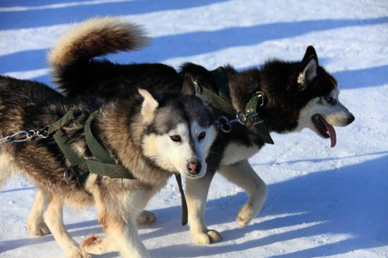 雪韵大街上,两只哈士奇奋力的拉着雪橇。
