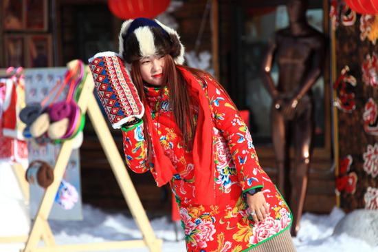 花棉袄红脸蛋,狗皮帽子红围巾,暗花棉裤白毡靴,山里的大妹子手指冻的通红,自顾自的玩着手机,一副买不买随意的表情。