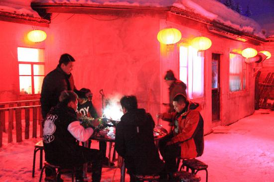 街旁一家庭旅馆,一伙人在雪地里支起了桌子,围着冒热气的火锅吃起来。