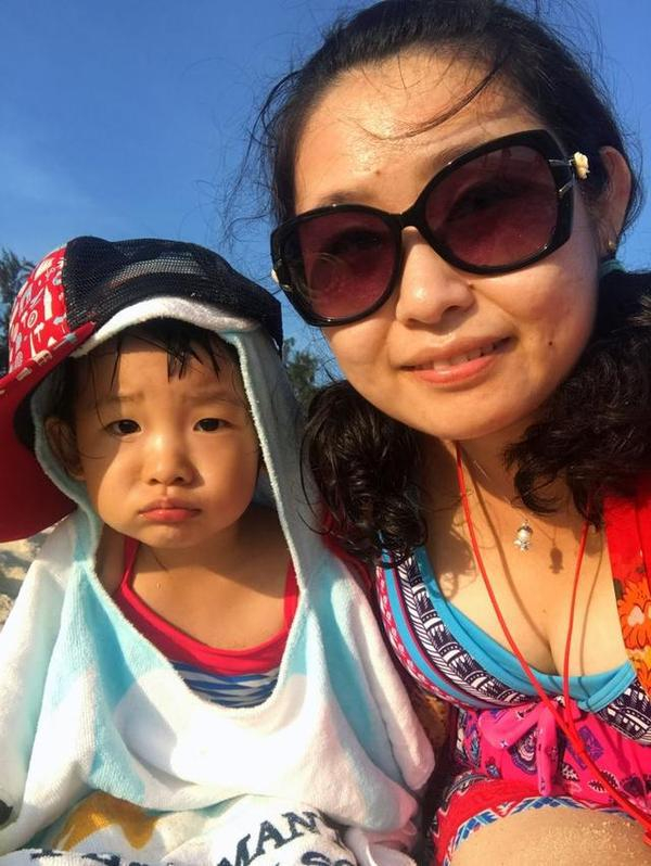 豆宝和豆爸海边玩,我一个人躺在伞下享受,嘿嘿,一切真美好!