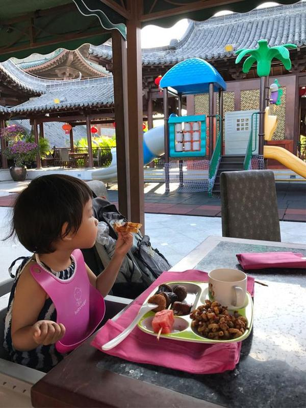 我们坐在餐厅外面吃,小豆豆边吃边看小朋友玩耍。
