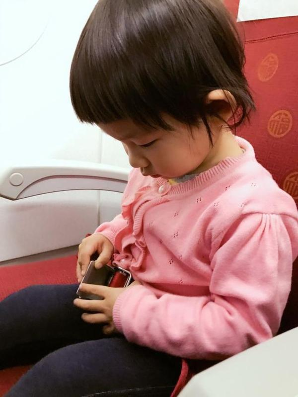 起飞时有小朋友哭闹,小豆豆一直在吃小零食喝水,并没有任何不适。小豆豆在飞机上玩耍将近两个小时后,最终被困意打败,睡着了。一直到飞机降落才醒。