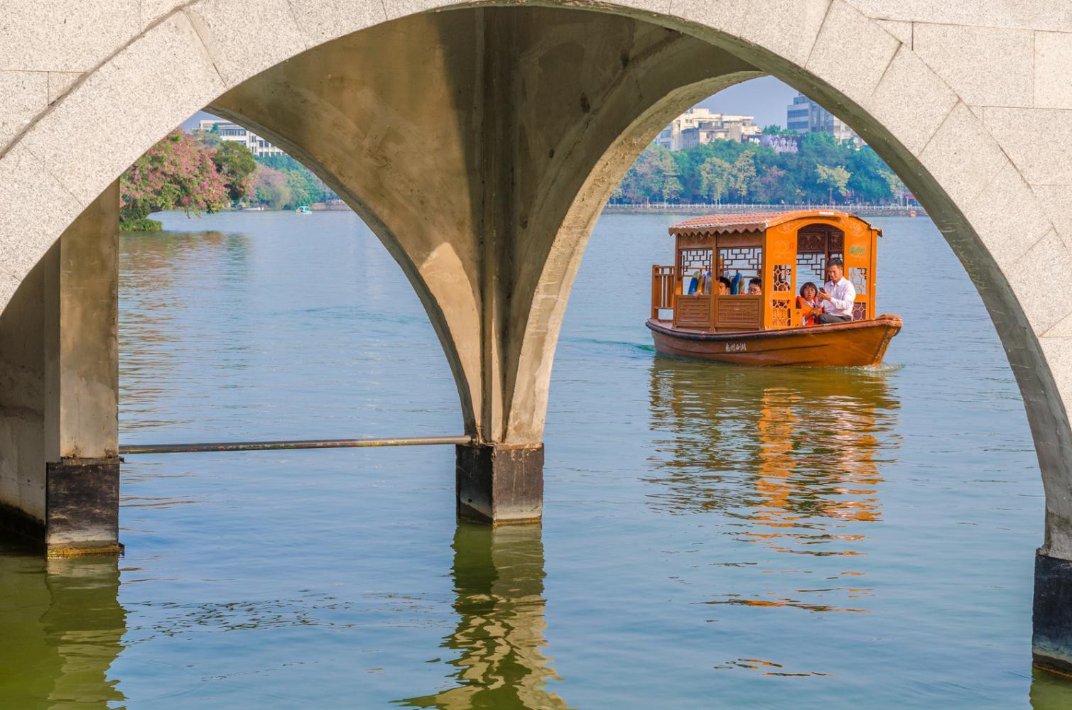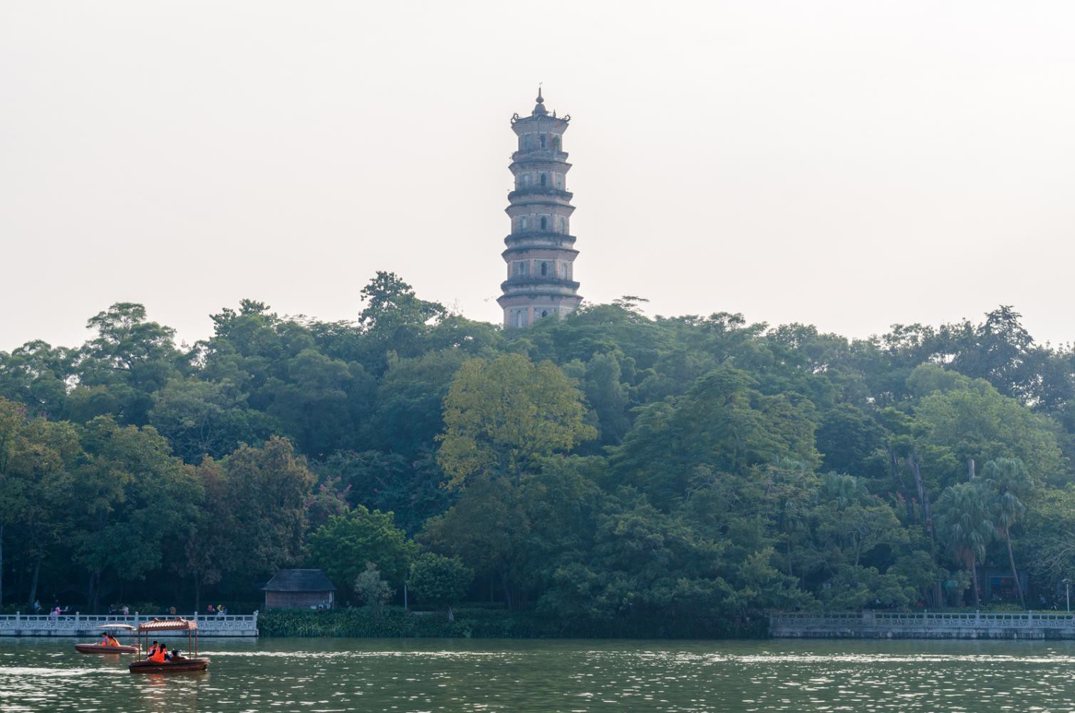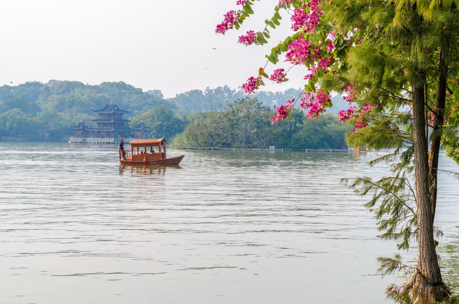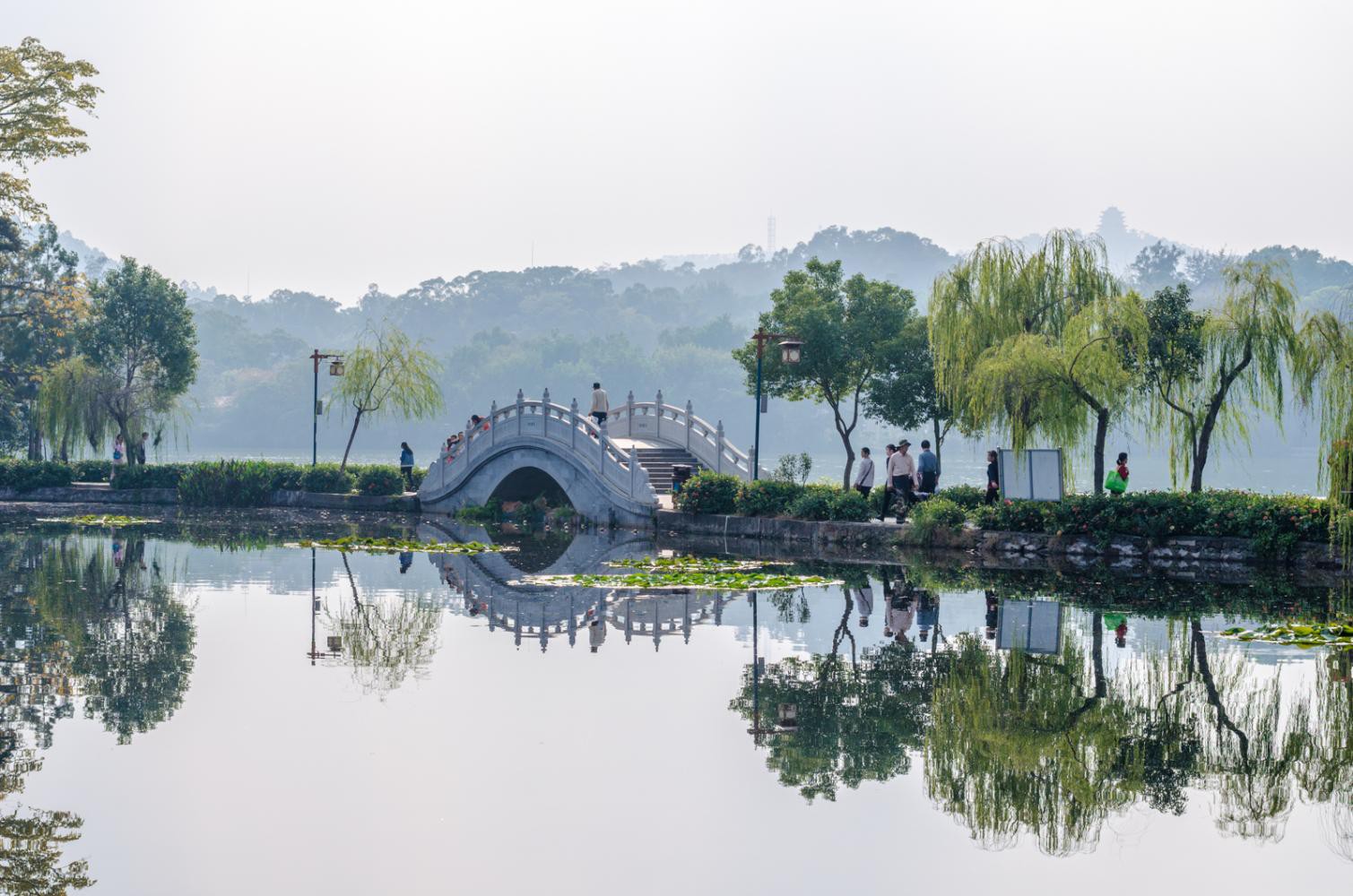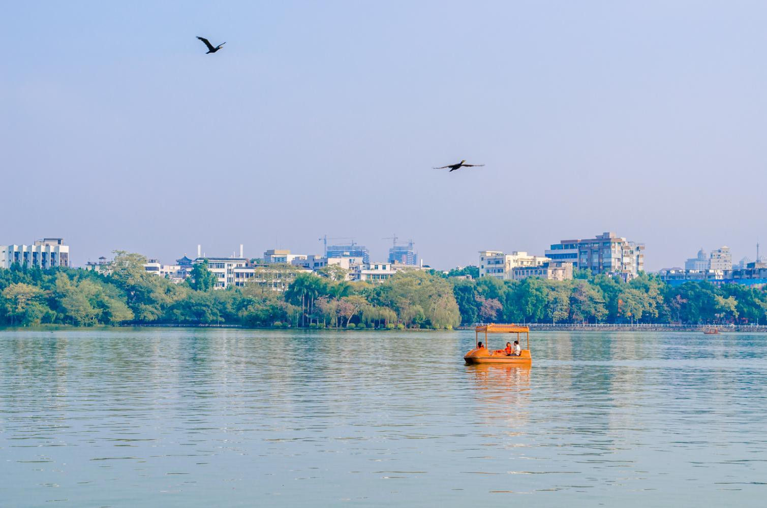 西湖位于惠州市中心,是一处免费开放的城市公园,冬天里也不冷,四周皆有绿树环绕,湖中还有一片湿地,生活着许多白鹭。