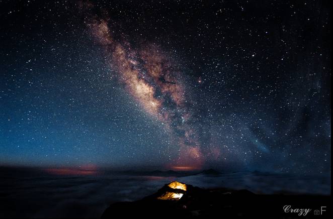 每一片高山上的天空,都是拍摄星空银河的好地方。帐篷是极佳的搭配。但是轿顶山,可是有小木屋的地方。更是绝佳的参考物。