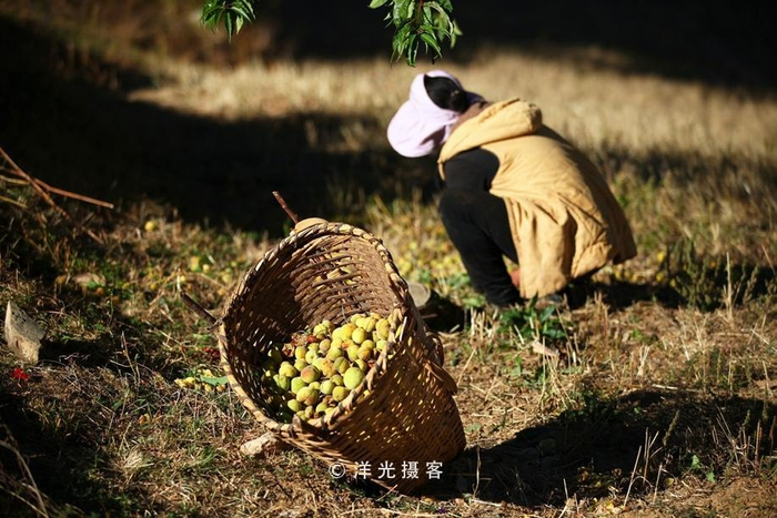 成熟的桃子掉得满地都是,山道那边迎面走来一个背着背篓的少妇,她是来捡桃子的,据说这桃核收集起来晒干后可以卖给收购商做药材。不一会,她就捡到了满满的一篓,满意的离开了。
