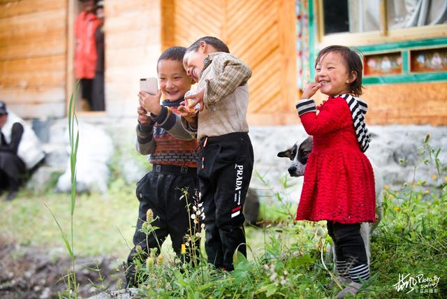 村子里一家饭店门口几个可爱的小孩子,拿 着手机和我们互拍。