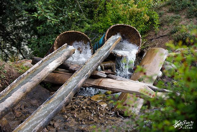 从山上流下来的水,再经过这两个水槽再顺着这两个竹篓流到山下,问了当地人才知道,山上有着小型的水力发电机。这算是当地微型的水力发电设备。发电量大不大不知道,起码看上去很环保。