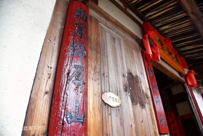 外墙虽朴素,但九斗庄内却像一位饱读诗书的长者,雕梁画栋间尽显智慧。走进九斗庄围墙侧边的门,便见老宅院墙高大,内部用材硕大,厅堂的左右厢房的隔扇窗和下绦环板上,全是楷书木刻,书法笔力端庄厚重,语辞气势雄浑磅礴,令人叹为观止!最叫人赞叹不已的是大厅前廊上的卷棚,抬头仰望,大约有30多米长的卷棚上以镂空雕的手法,刻满了吉祥图案,梁架则以浮雕透雕工艺,雕刻了许多栩栩如生的人物、花卉等,在卷棚上精雕细镂,永泰众多古民居中,九斗庄也是唯一,可谓不惜工本。