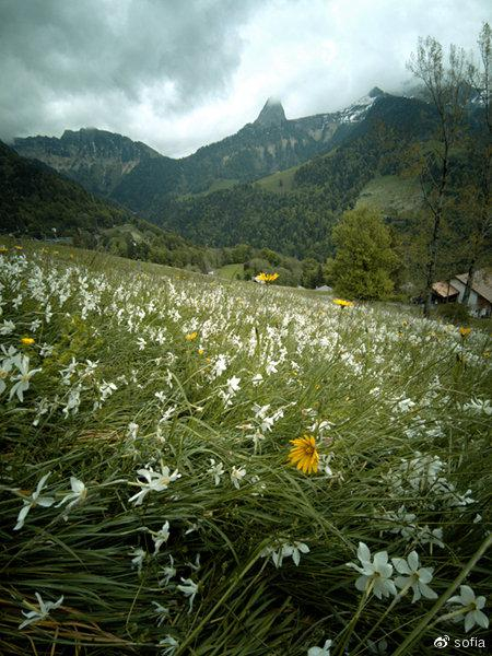 等奶牛小分队通过,继续开车绕山,来到了LES AVANTS小村的火车站。车站前搭了些帐篷,几个年轻人在出售有关水仙花的资料、纪念品还有新鲜的花束。 下了车,抬眼可看见对面山坡上被大片白色花朵包围的小木屋。车站附近的盘山公路两边也有不少水仙。掏出手机随便拍了两张,正打算好好静距离看看那些花儿,豆大的雨点从天上落了下来,而且越来越密,不一会儿就下得稀里哗啦,我赶紧奔回车里,前往几十公里外下榻的小村去了。