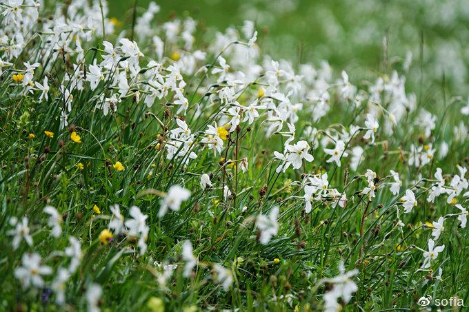 它们的花瓣和叶子也显得比中国水仙更“薄”一些,因而更觉柔美,但,绝不柔弱。相反,它们有着一种比家养水仙更为硬朗的气质。 也是,这些生在在海拔一千米以上的水仙,冬天球根深埋在冰雪之下,初春,看似纤细的叶片从残雪和泥土里钻出来,在高山上的疾风、暴雨、雷电和日晒的更迭中肆意生长,终于孕育出这一年一度从不失约的热烈绽放, 它必然会有一种刚硬的风骨。 如果说,家养的中国水仙如温婉恬静的大家闺秀,这些阿尔卑斯大山上的野生水仙更像是桀骜飘逸的世外仙子。
