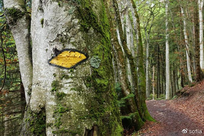 或许为了尽量保持林子的自然状态吧,徒步路标到树林里就变成了这种画在大树干上的黄色菱形,