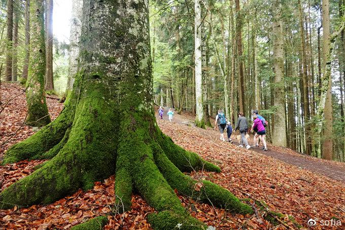 然后走进一大片树林。就是阿尔卑斯山区常见的针叶林,只是那些大树接近根部的地方都覆盖着一层厚厚的绿色苔藓,就像都穿上了绿丝绒的长筒袜,可见这林子有多潮湿。