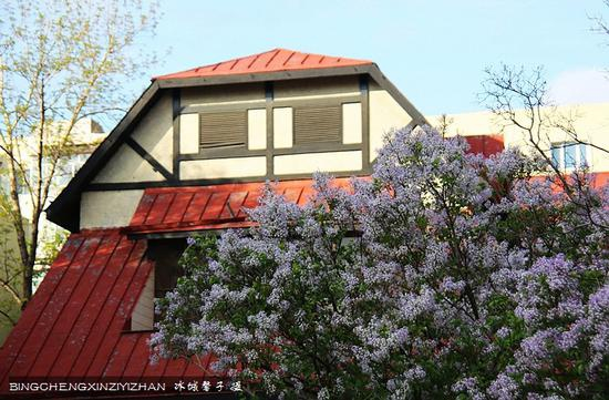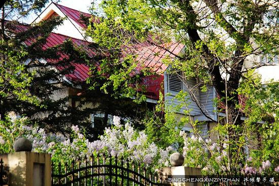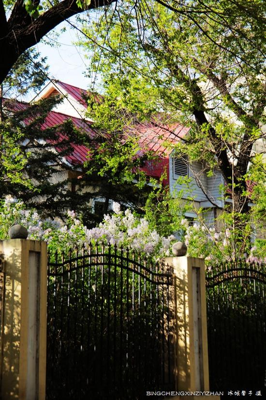 尤其喜欢这幅景致,欧风建筑掩在似隐似露的黄墙栅栏之内,高大的树伞下是在阳光下绽放着的丁香花,这也是我心目中的哈尔滨浪漫气质。我从这条幽静的小街走过,我在这面墙下漫步,我望着那红顶黄墙间的白色窗子生也了好多浪漫的联想:坐在窗前嗅着窗外飘来的丁香花的淡淡香,看一本书,喝一杯咖啡,或者就伏在窗前发发呆。