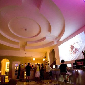 耀眼的银箔屏风簇拥着中央的水池,凭空造出了一个对称的空间视觉;银色树叶纹弯曲形金属幕墙把两层楼高的中庭包裹起来;18根巨大柱形灯拔地而起,一直伸向中庭的顶部,它的背后则是大量的流畅线条和几何对称图形;由大小不一的同心圆组成的隔断墙,具有强烈的视觉冲击力,艺术化装饰效果逼人。