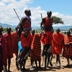 下了山坡,来到一片视野开阔的高地,是Oloololo之门。在村口,按事先约定,我们每人交付20欧元,由一个马塞人收好。然后他们吹响大羚羊号角,打鼓唱歌,排队跳起迎宾舞来。跳了一圈又一圈后,他们列成一横排,开始跳高比赛。虽然他们都只穿一双废车胎改做的凉鞋,但好像脚上有发条似的,一个比一个跳得高。这是就是著名的马塞弹跳。他们认为跳得越高,越勇敢,越有男性魅力。他们邀请男游客一起跳,还给他们戴用狮子头颈皮做的帽子。但游客就像河马混在潇洒的长颈鹿中间,笨重而滑稽。据说,马塞小伙取媳妇,要给女家10头牛,但如果是跳高冠军,就可以免去。胖胖的大缅听说后,就打趣地叫他老婆“10条牛”。弗洛伦丝也不示弱,说,我也不要你的10条牛,你只要把肚子跳得小点就行了。这倒是真的,不管是不是这种弹跳使马塞人身材修长苗条,反正挺着大肚子,那10条牛是非交不可的了。