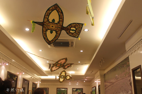 展馆上空,悬挂着一顶顶漂亮的风筝。原来,风筝在马来西亚被尊为“稻神”;在当地,还流传着一个有着神话色彩的动人传说:在很久以前,有个农夫在田里遇到一个迷路的女孩,便把女孩领回了家;在农夫的悉心照料抚养,女孩出落的越来越漂亮,农夫和乡亲们的收成也越来越好。谁知农夫老婆生出妒忌之心,使计将女孩赶出了家门,随着女孩的消失,村子里庄稼的收成竟越来越差了。村里人恍然大悟,那漂亮的姑娘其实是稻神。后来在高人指点下,农夫用稻草和干芦苇做了一个漂亮的东西,放飞到空中,并向其表示忏悔;随着风筝的升空,人们的收成又好起来,日子又富裕了起来。故而马来西亚人喜欢放风筝,既是对美好生活的向往,也是为了向稻神表达致意。