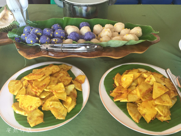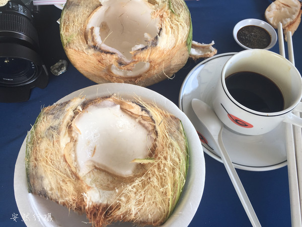 当地特产的黑咖啡,说是没有添加奶粉,入口却有淡淡焦糖甜味,有着让人喝过还想喝,欲罢不能的魔力。这椰子想来非常新鲜,椰汁喝完剖开后,椰肉用吸管就能戳下来,且椰肉绵软鲜美,食后口齿生津,余香绕口,大受我们欢迎。