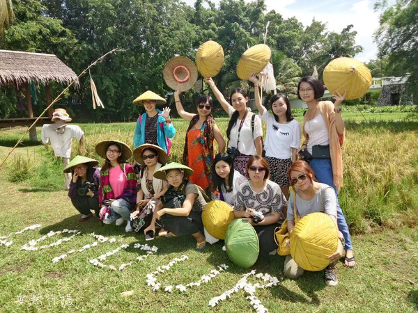 博物馆院子里,还有个小小的花、草植物园,带领我们参观的工人,随手揪一把就是有着驱蚊或者其它各种用途的芳香植物;四周还有高大的芒果、椰子等果树,皆挂着累累果实。时值鸡蛋花开季节,空气中也萦绕着清香优雅的鸡蛋花香,低头随手捡拾,就能捡到满满一大捧花儿。田野间青草地上,我们用花语含义为“孕育希望、复活、新生”的鸡蛋花拼出乐途logo并合影,晒出我们的兴奋与幸福。