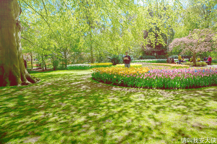 对将要看到的大公园,你会有怎样的想象呢?不管你想的有多美,绝对没有看到的这样美。正午阳光尖锐刺眼,可一进霍肯霍夫公园,心平静了, 无数棵吐露新芽的大树缓冲着太阳光,光线变得柔情蜜意,嫩绿蛋黄的光晕影影绰绰,花树密密碎碎地将淡粉色糅杂进空气里,眼前的一切都被一块硕大的朦胧滤镜笼罩了起来,满地光斑晃动闪烁,这是一场植物的迪斯科舞会啊。再看看那些平时颜色霸道的花吧,郁金香,风信子,百合,全都变得风情万种。讨巧的设计将花朵们妥善安放,让它们尽情展现自己的美,这儿的园林设计师,真是个有心机的人。
