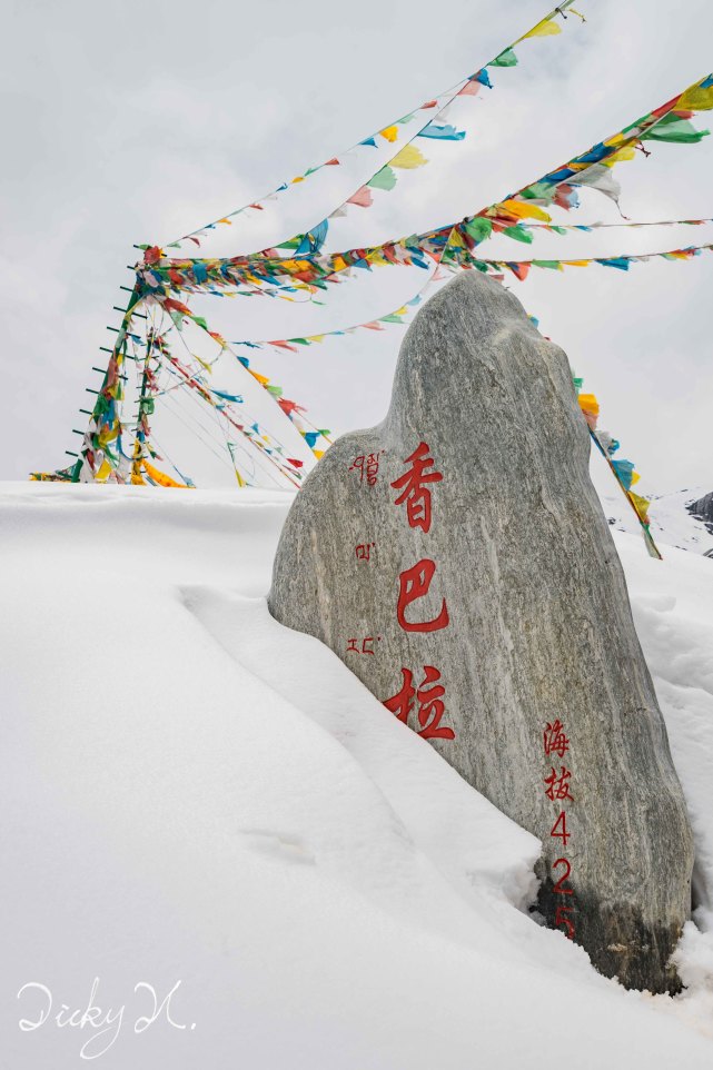 “香巴拉,海拔4250米”。由于在雪线以上,冰雪把石碑都淹没了。香巴拉(Shambhala),藏语中意思是一个传说中的极乐园,人间天堂,世外桃源。我不懂藏语,只知道,眼前的这一片纯白无垢的景色,大抵就和我想象中的世外桃源差不多吧。