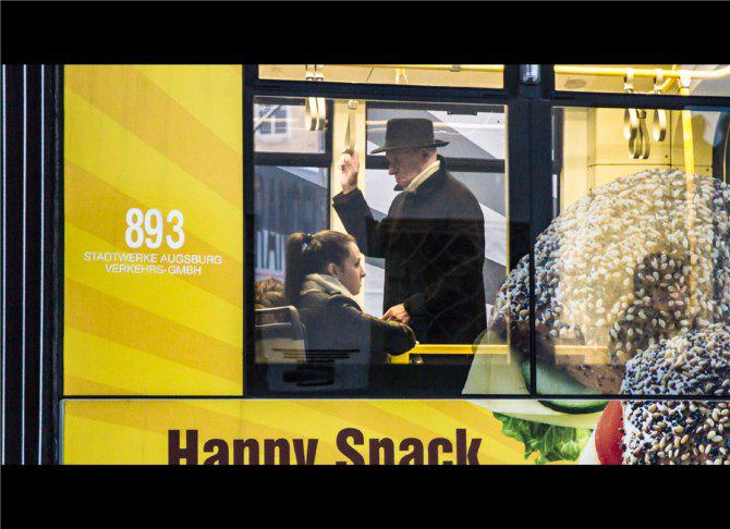 透过布满广告的车窗,