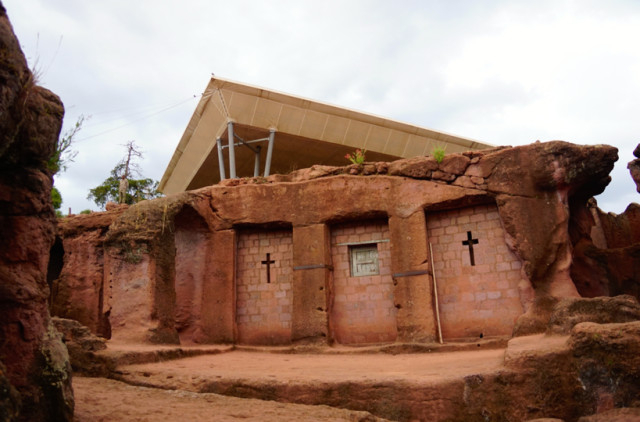 很快,我们来到了圣乔治教堂。这座教堂的精华之处在于整块巨型岩石被雕凿成正十字形。而平面的屋顶上也雕刻了一个巨大的十字架,这样的设计更是为此教堂增添了一份神性,这在某种程度上也成为了埃塞俄比亚的象征。