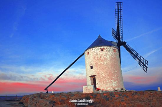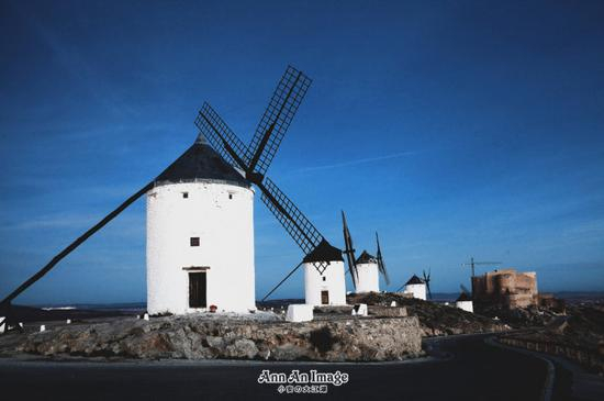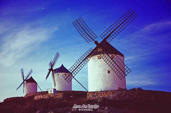 风车建造在一座山丘上,地势开阔,远远望去,它们一座座小巧玲珑的,走近每座都很大。晨练的人来了走了,天幕深蓝,繁星闪烁。天边渐渐泛红,风呼呼吹着,风车羽翼不转,它们被固定了,只用于观赏。当年堂吉诃德见到它们时,它们还会动,堂吉诃德大喊: